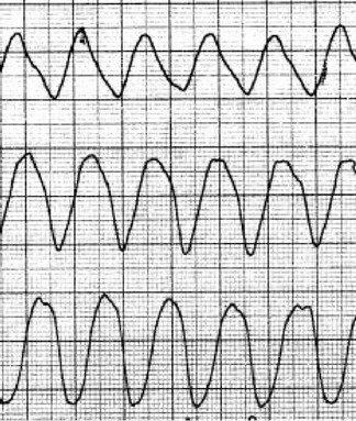 ЭКГ ребенка с ГКМП, зарегистрированная во время обморочного состояния; трепетание желудочков.