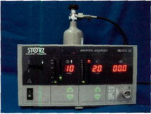 Электронный инсуффлятор обеспечивает постоянную подачу инсуффли-руемого газа (С02) из газового баллона в брюшную полость для создания определенного пространства и поддержания заданного давления при выполнении эндоскопической операции. Современные инсуффляторы автоматически поддерживают установленное давление в брюшной полости больного, меняют скорость подачи газа в зависимости от скорости его утечки (рис. 2-12). При этом имеются два или более режимов подачи газа с различной скоростью — от 1 до 10—20 л/мин.