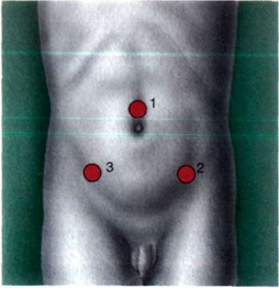 Рис. 16-2. Расположение троакаров: 1 -5,5 мм троакар; 2 - 5,5 мм или 3 мм троакар; 3 - 5,5 мм