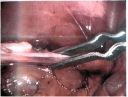 3. Под контролем оптики через него вводят атравматический зажим с кремальерой, осторожно захватывают мобилизованное яичко.