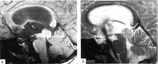 Больные обычно легко и быстро выходят из наркоза. Если гипертензивная симптоматика в клинической картине преобладала, то практически у всех больных уже с первого дня отмечается явное улучшение состояния, разрешаются все окклюзионные и гипертензивные симптомы. Чуть позже смягчаются и проходят другие симптомы гидроцефалии (атаксия, диплопия, мнестические расстройства и т.д.). Следует особо отметить, что такое клиническое благополучие обыч-но не соответствует степени вентрикуломегалии и давлению в люмбальнои цистерне. Если ее пропунктировать на 1 —2-й день после операции, то давление обычно оказывается повышено. То же можно сказать и о размерах желудочков,