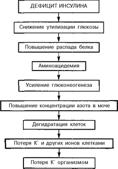 отчетливо видна общая отправная точка возникающих нарушений, которая заключается в снижении утилизации глюкозы периферическими тканями. Во-вторых, наглядно выступают сложные взаимосвязи между углеводным, жировым, белковым, электролитным и водным обменами. Наконец, схема иллюстрирует рассмотренные выше причинно-следственные отношения; она дает некоторые представления о сложности патогенеза данного состояния и показывает, что многие взаимосвязанные нарушения возникают одновременно.